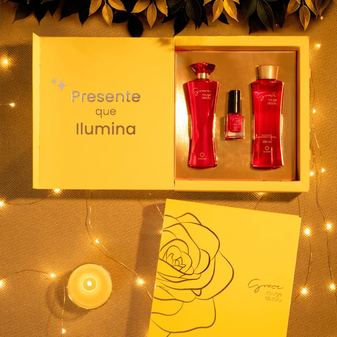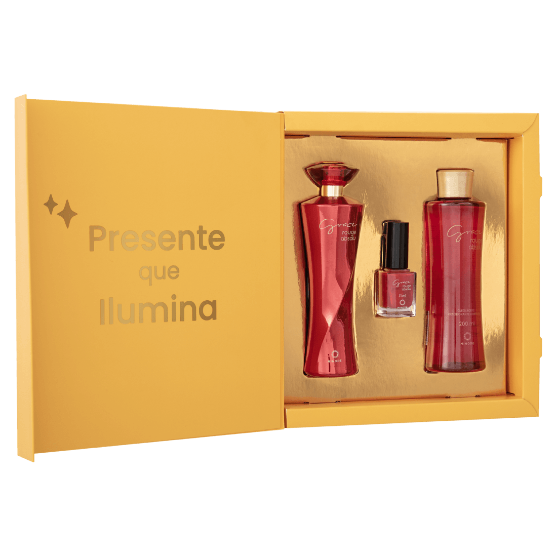 A trilogia que realça a beleza em cada detalhe: o perfume icônico Grace Rouge, um esmalte sofisticado para unhas impecáveis e um óleo corporal luxuoso que deixa a pele radiante.